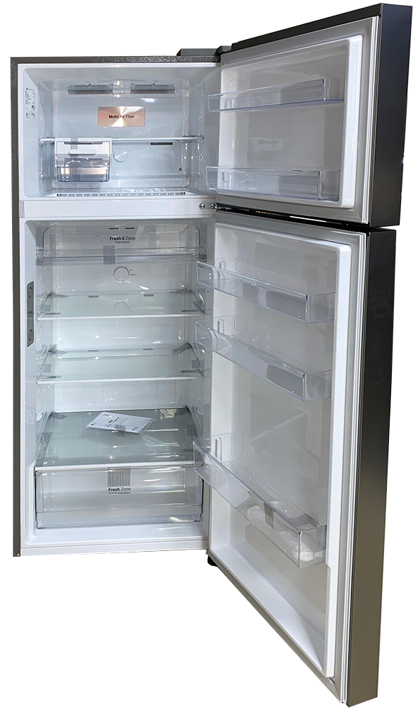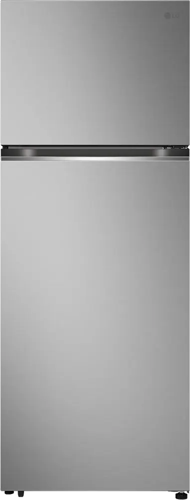 ثلاجة إل جي بفريزر علوي بسعة 461 لتر، لون فضي، مزودة بتقنية DoorCooling+™ التي توفر تبريدًا أسرع وأكثر تساويًا، وضاغط عاكس خطي لتوفير الطاقة. الأبعاد: 700 مم عرض × 1845 مم ارتفاع × 725 مم عمق.