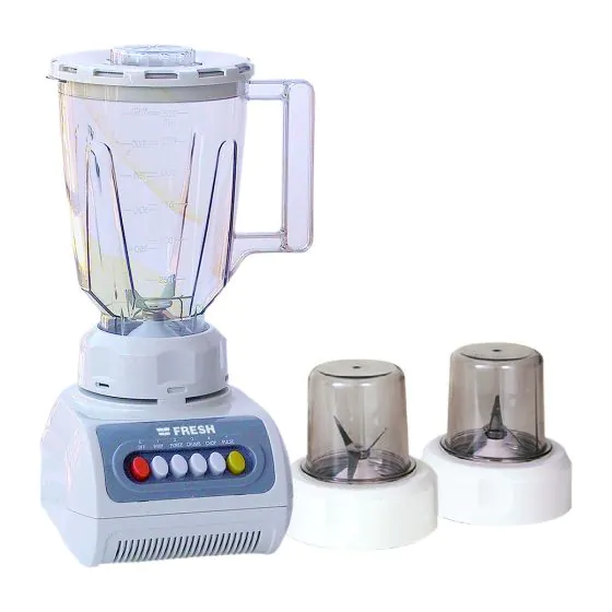 يتميز خلاط فريش جامبو 999 بمحرك قوي بقدرة 500 وات، مما يتيح لك تحضير مختلف الوصفات بكفاءة عالية. يأتي الخلاط بوعاء سعة 1.5 لتر مصنوع من البلاستيك المقاوم للكسر، مما يضمن المتانة وسهولة التنظيف. يحتوي الجهاز على سرعتين بالإضافة إلى خاصية النبض (Pulse) لتلبية احتياجات الخلط المتنوعة. الشفرات الحادة المصنوعة من الستانلس ستيل تضمن خلط ومزج المكونات بكفاءة. التصميم الأنيق باللون الأبيض يضفي لمسة جمالية على مطبخك.