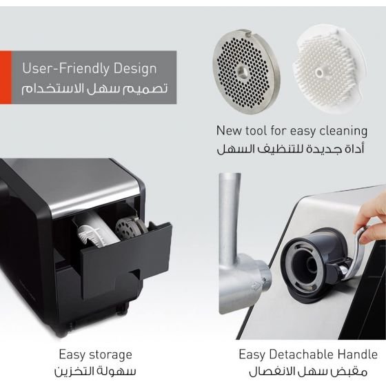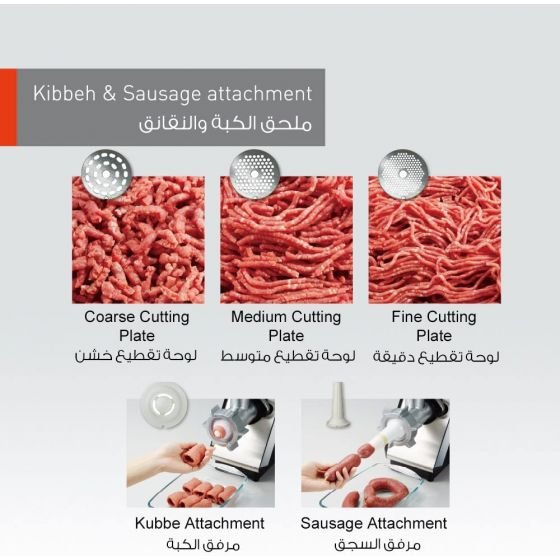 تتميز مفرمة اللحم باناسونيك MK-ZJ3500 بمحرك قوي بقدرة 3500 وات، مما يتيح لك طحن كميات كبيرة من اللحم بسرعة وكفاءة. تم تجهيزها بشفرة قطع مصنوعة في اليابان من الفولاذ المقاوم للصدأ، مصممة بزاوية وشكل محسوبين بعناية لقطع ألياف اللحم بكفاءة عالية. تأتي المفرمة مع ثلاثة ألواح تقطيع قابلة للتبديل (خشن، متوسط، ناعم) لتناسب مختلف احتياجات الطهي، بالإضافة إلى ملحقات لصنع السجق والكبة، مما يضيف تنوعًا في تحضير الأطباق. يتميز الجهاز بتصميم أنيق ومتين مع قادوس معدني بالكامل، ويوفر مساحة لتخزين خمسة ملحقات وأداة تنظيف داخل الوحدة الرئيسية للحفاظ على ترتيب المطبخ. كما يحتوي على وضعين للسرعة ووظيفة عكسية للتعامل مع أي انحشار للمكونات أثناء التشغيل. هذه المفرمة مصممة لتقديم أداء عالي مع ضوضاء أقل، مما يجعلها إضافة مثالية لمطبخك لتحضير وجبات لذيذة وصحية.