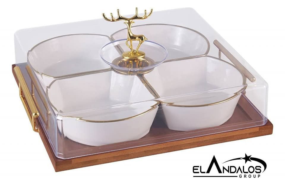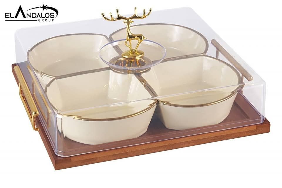 طقم تسالي بورسلين ٤ قطع مع حامل خشب وغطاء أكريلك – الأندلس